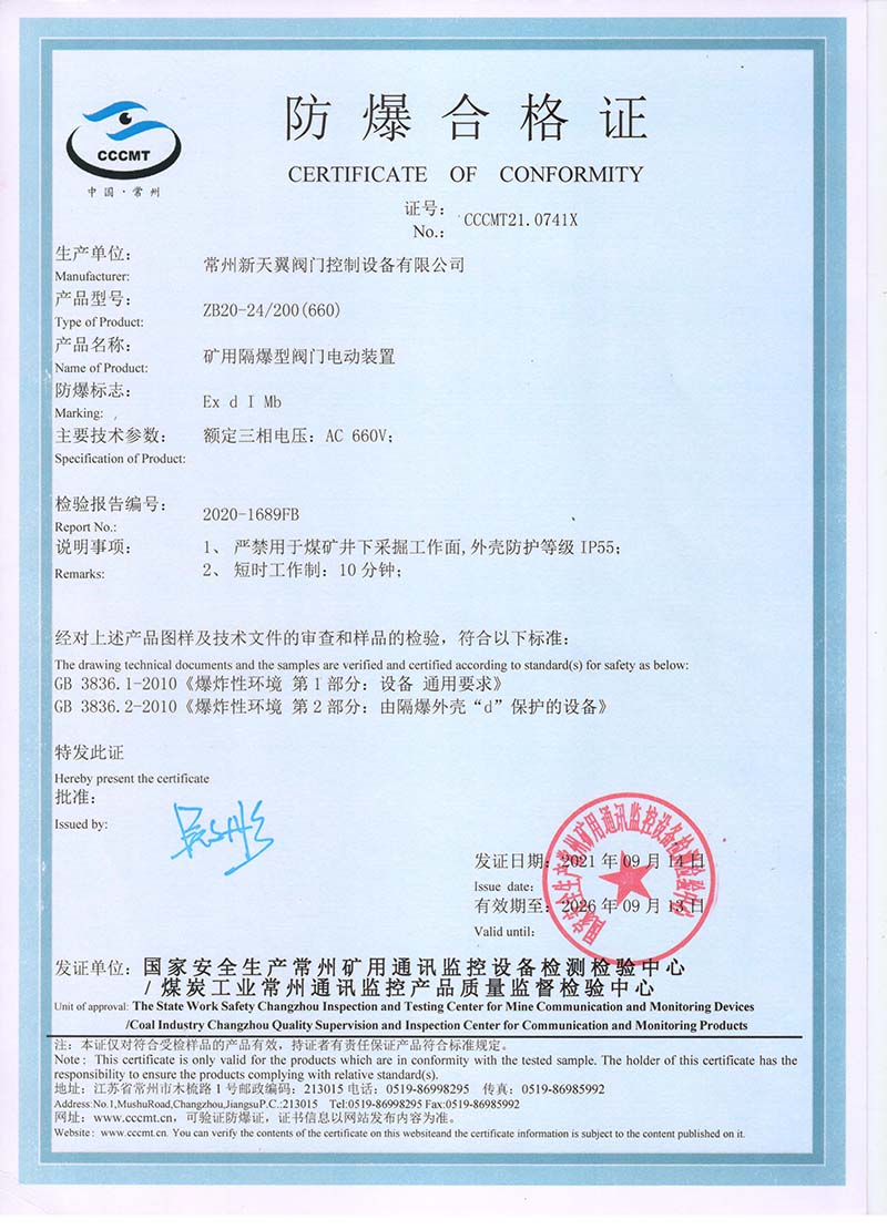 隔爆型DZB 中國國家強制性產品認證證書108.2